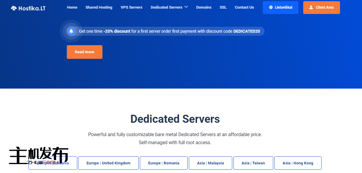 Hostika.LT裸机(自我管理)专用服务器仅需 23.20 欧元/月,位于欧洲:立陶宛、罗马尼亚、英国 (UK) 和亚洲:马来西亚、台湾、香港、日本。